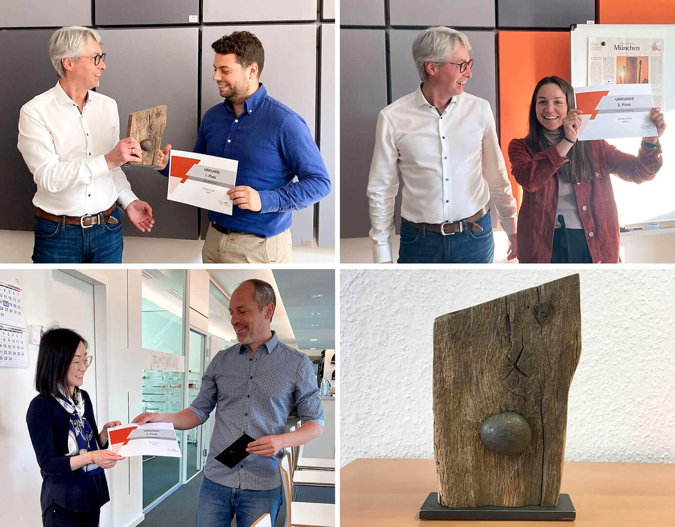 Zum vierten Mal wurde dieses Jahr unser „Stein-im-Brett-Award“ - auch Highperformer-Award genannt - verliehen. Er geht an MitarbeiterInnen, die herausragende Performances im Rahmen der Projektarbeit erzielt haben und wird jedes Jahr bei einem unserer Zukunftsdialoge verliehen. Der Zukunftsdialog ist ein Mitarbeiterevent, das quartalsweise stattfindet und bei dem wir gemeinsam die Zukunft des Unternehmens definieren, uns austauschen und vor allem gemeinsam unsere Erfolge feiern und Spaß haben. Da der erste Zukunftsdialog 2022 aufgrund der aktuellen Maßnahmen noch rein virtuell stattfand, wurde der Award und die Urkunden im Nachgang persönlich durch einen unserer Geschäftsführer Richard Weller bei der Einweihung der überarbeiteten Büroflächen in München feierlich übergeben. Unsere Kölner Kollegin Qian bekam ihre Urkunde stellvertretend durch einen der Partner Florian Dubisch überreicht.