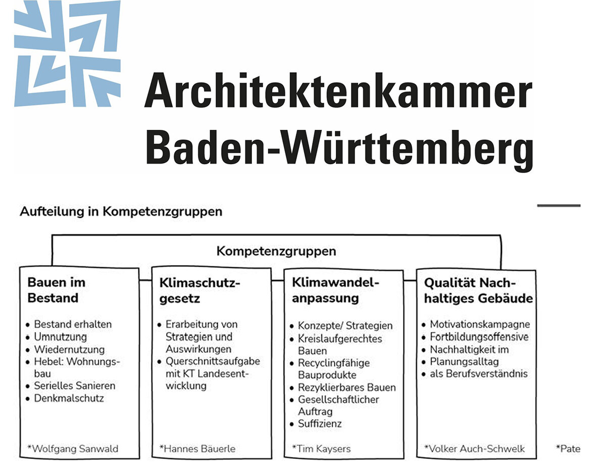 Das Kompetenzteam Nachhaltigkeit ist das größte unter den acht neu geschaffenen Kompetenzteams der AKBW. Dem Landesvorstand war es mit der neuen Organisationsform wichtig, aktuelle Fragestellungen aufzugreifen und so sprechfähig und wirksam zu sein, gegenüber Politik und Gesellschaft. Die erste offizielle Sitzung findet am 26. Juni statt und das Kompetenzteam wird in vier Unterarbeitsgruppen zu den Themen, Bauen im Bestand, Klimaschutzgesetz, Klimawandelanpassung und Qualität Nachhaltiges Gebäude arbeiten. Die AKBW schreibt: „Wir sind sehr froh, in Person von Michael Dax externen Sachverstand im Team zu haben." Und wir wünschen Michael viel Freude und Wirksamkeit in seinem neuen Ehrenamt.