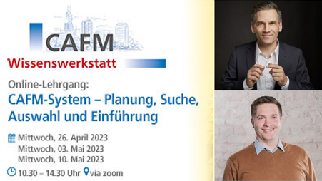 Den Startschuss für den Online-Lehrgang macht am 26. April Maik Schlundt mit dem Thema „CAFM als Werkzeug für das Facility Management“. Dr. Christof Duvenbeck rundet das Ganze am 10. Mai mit dem Modul „Daten im CAFM“ ab.