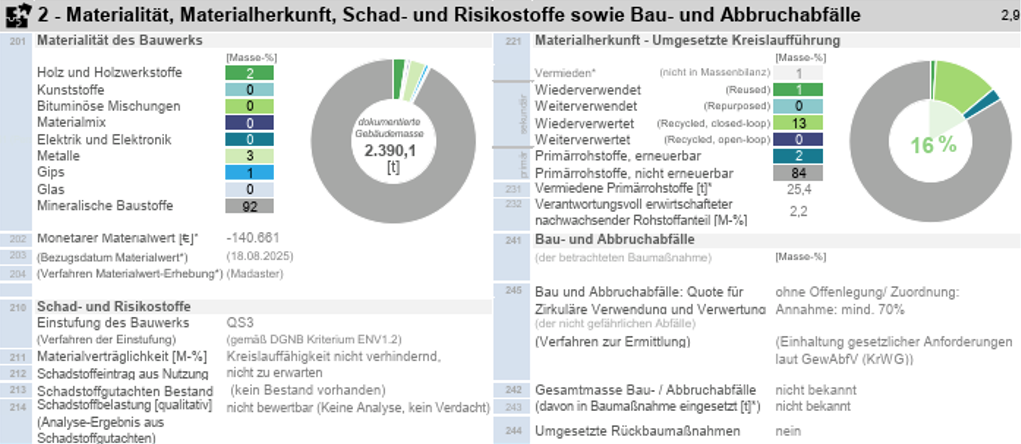 - Demontier- und Trennbarkeit: Die konventionelle Bauweise zeigt Schwächen in der Demontierbarkeit – das wird transparent im Gebäuderessourcenpass aufgezeigt. Im Projekt wurden zwar z. B. demontierbare Teppichfliesen eingesetzt, die aufgrund der massebezogenen Auswertung jedoch kaum merklich in die Bewertung einfließen. Positiv fällt hingegen die werkstoffliche Trennbarkeit auf, da überwiegend monomaterielle Baustoffe verwendet wurden. Dennoch gilt: Verklebte Schichten und Anhaftungen können die tatsächliche Recyclingfähigkeit stark einschränken, hier ist eine ganzheitliche Betrachtung entscheidend.