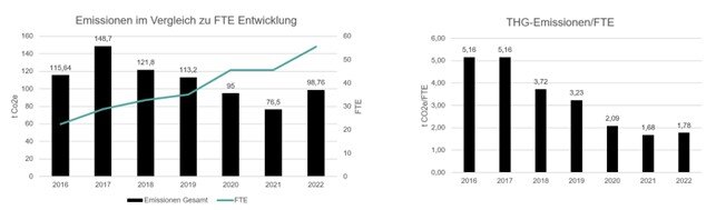 Wir konnten feststellen, dass Homeoffice- und Pendleraktivitäten einen wesentlichen Teil unserer Treibhausgasemissionen ausmachen. Um alle Faktoren möglichst gut zu berücksichtigen, setzen wir für die Arbeit im Homeoffice seit 2021 eine Energieverbrauchspauschale pro mobilem Arbeitstag an. Die freie Wahl des Arbeitsortes ist jedoch Teil unserer agilen Arbeitsweise. Wir arbeiten an möglichen Lösungen, jedoch können wir diese Faktoren nicht direkt beeinflussen.
