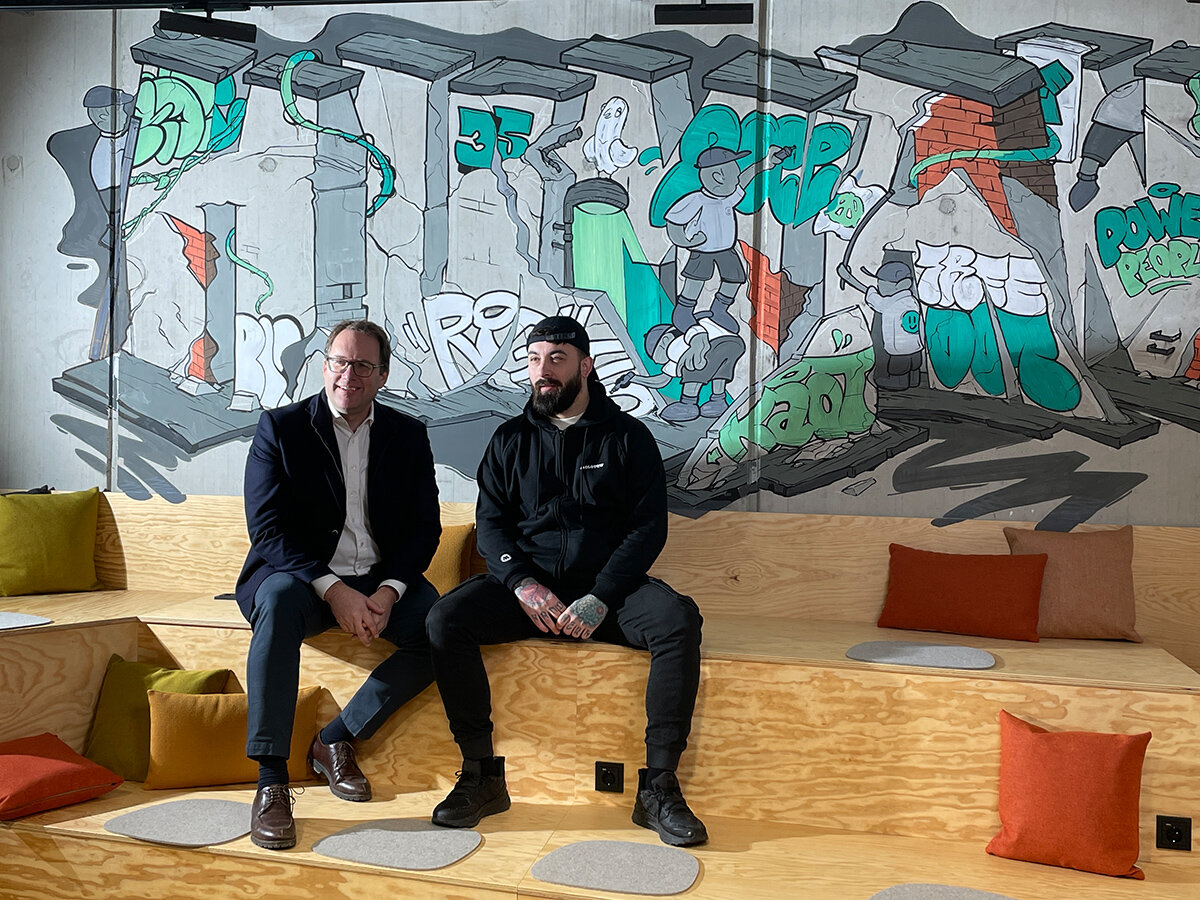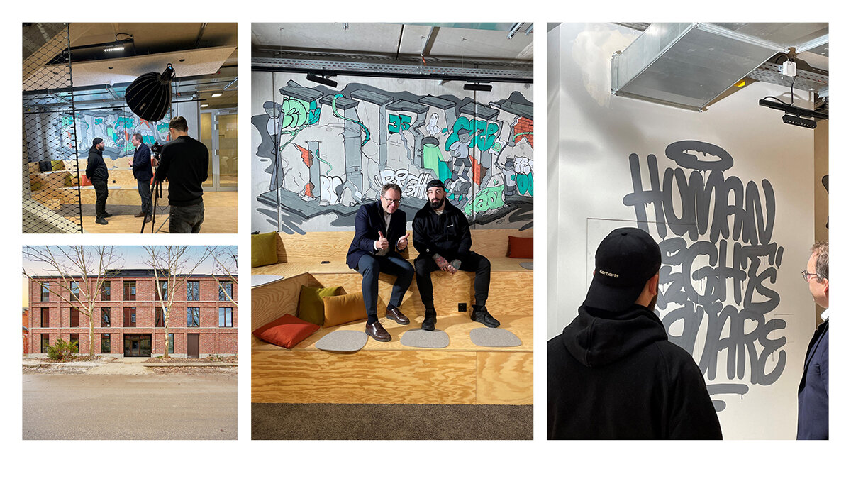 Normalerweise stößt man im Freien auf Graffitis und nicht immer freuen sich alle über deren Auftauchen. Doch so, wie bei der RESI so einiges anders ist als bei anderen Bürogebäuden, steht man im Erdgeschoss unseres neuen Firmensitzes der RESI, gewollt und begeistert vor einem coolen Indoor-Graffiti. Genau oberhalb einer Holztribüne, die als Treff-und Versammlungsort dient, findet sich das Werk von Illustrator André Nauman. Sein Titel lautet "Human Rights Square" und passt ideal zur neuen Adresse unserer Alpha IC am Platz der Menschenrechte 1 auf dem Lagarde-Campus in Bamberg. Auf diese Weise ist die RESI als Netto-Null-Gebäude ohne Heizen und Kühlen nicht nur ein Statement für eine nachhaltige Immobilienwirtschaft sondern eben auch ein klares Statement für Demokratie und Menschenrechte!