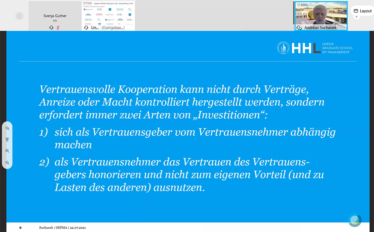 Die Einführung in den Tag übernahmen die Lounge- und Junior-Lounge-Leiter Bayerns: Sebastian Hölzlein, Wolfgang Inderwies, Bernhard Obermaier, Walter von Koskull, Dennis Hepp und Philipp Ochel. Michael Stadelmann und Ferdinand Karnoll waren virtuell zugeschaltet. Highlight zum Einstieg war die Keynote von Prof. Dr. Andreas Suchanek, der an einem Gedankenspiel demonstrierte, dass eine vertrauensvolle Zusammenarbeit zwischen Beschaffer und Anbieter für beide Seiten den größten Mehrwert bietet. Er plädierte dafür, dass jeder Einzelne selbst aktiv einen kleinen Schritt nach vorne gehen muss, um eine vertrauensvolle Basis zu schaffen.