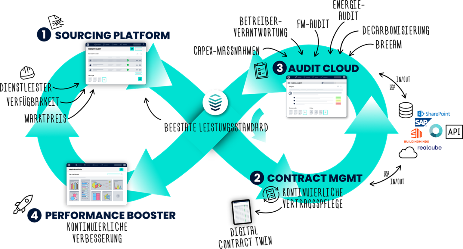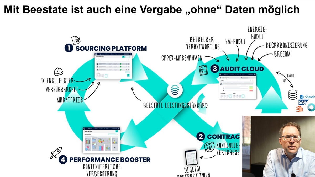 Beestate® ist ein prozessorientiertes Plattformmodell für den gesamten FM-Prozess. Das wesentliche Ziel ist es, Daten und Informationen in einem Kreislauf abzubilden und stetig anzureichern. Nicht nur im Sourcing-Prozess, sondern darüber hinaus auch in der Implementierung, also der kontinuierlichen Pflege von Aufträgen, bis hin zur Auditierung und einem entsprechenden Performance-Dashboard.
