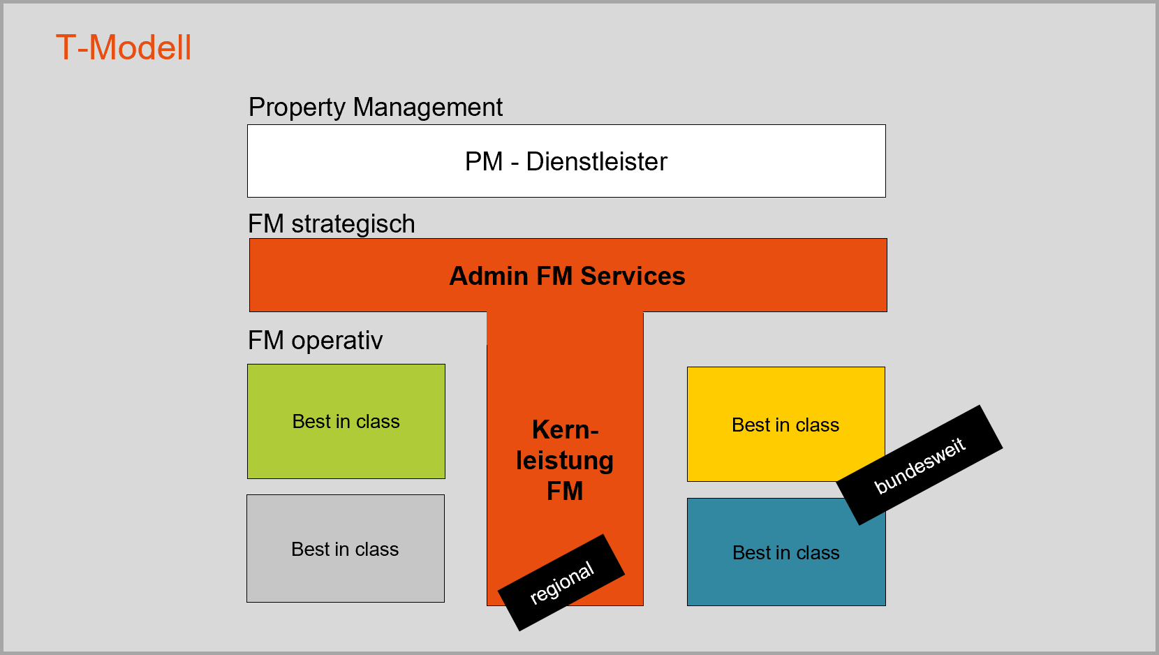 Für die Alpha IC hat sich in der Vergabe, insbesondere im Hinblick auf Portfolio-Vergaben, das T-Modell durchgesetzt. Die Bandbreite der Leistungen reicht von der Administration von FM in der Kombination mit Basis-Dienstleistungen ergänzt mit Spezialfeldern, die wir als Best-in-Class-Leistungen bezeichnen.