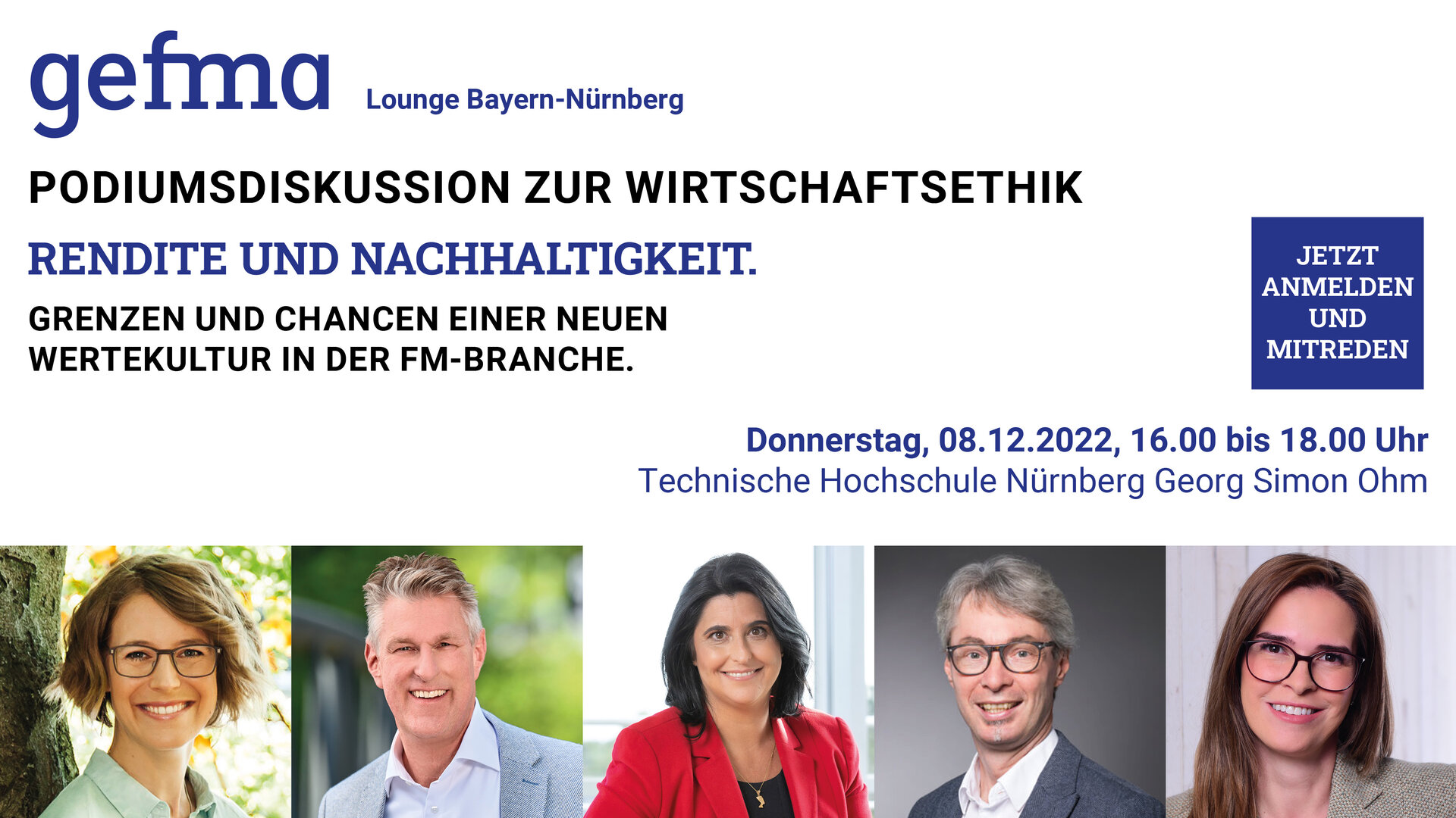 Die Akteur:innen in der Immobilienbranche, die für circa 40 Prozent aller CO² Emissionen verantwortlich ist, sind umso mehr aufgerufen, zu handeln. Die TH Nürnberg zusammen mit der gefma Lounge Bayern-Nürnberg laden deshalb am Donnerstag, 08.12.2022 von 16 bis 18 Uhr zu einer Podiumsdiskussion. Wir möchten dazu ermutigen und provozieren, in unseren jeweiligen konkreten Handlungsfeldern nachhaltig zu wirtschaften.