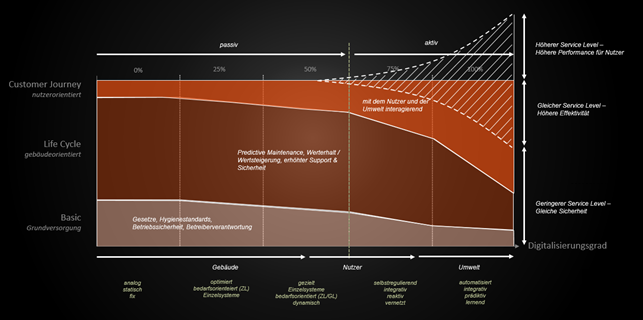 Bei der Entwicklung des Standards werden alle FM-relevanten Prozesse einzeln auf das Potential des Einsatzes von IoT-Technologien untersucht und mit Beispielen erläutert. Jeder Prozess verfügt über fünf Innovationsstufen und entsprechende IoT-Massnahmen, um die Prozesse unterschiedlich intelligent zu gestalten. Basierend auf der Innovationsstufe wird anschliessend die Anforderungen an die Organisation, Infrastruktur und Sicherheit abgeleitet, sodass die Nutzer des Standards eine Roadmap erhalten, wie diese Prozesse im Betrieb implementiert werden können.