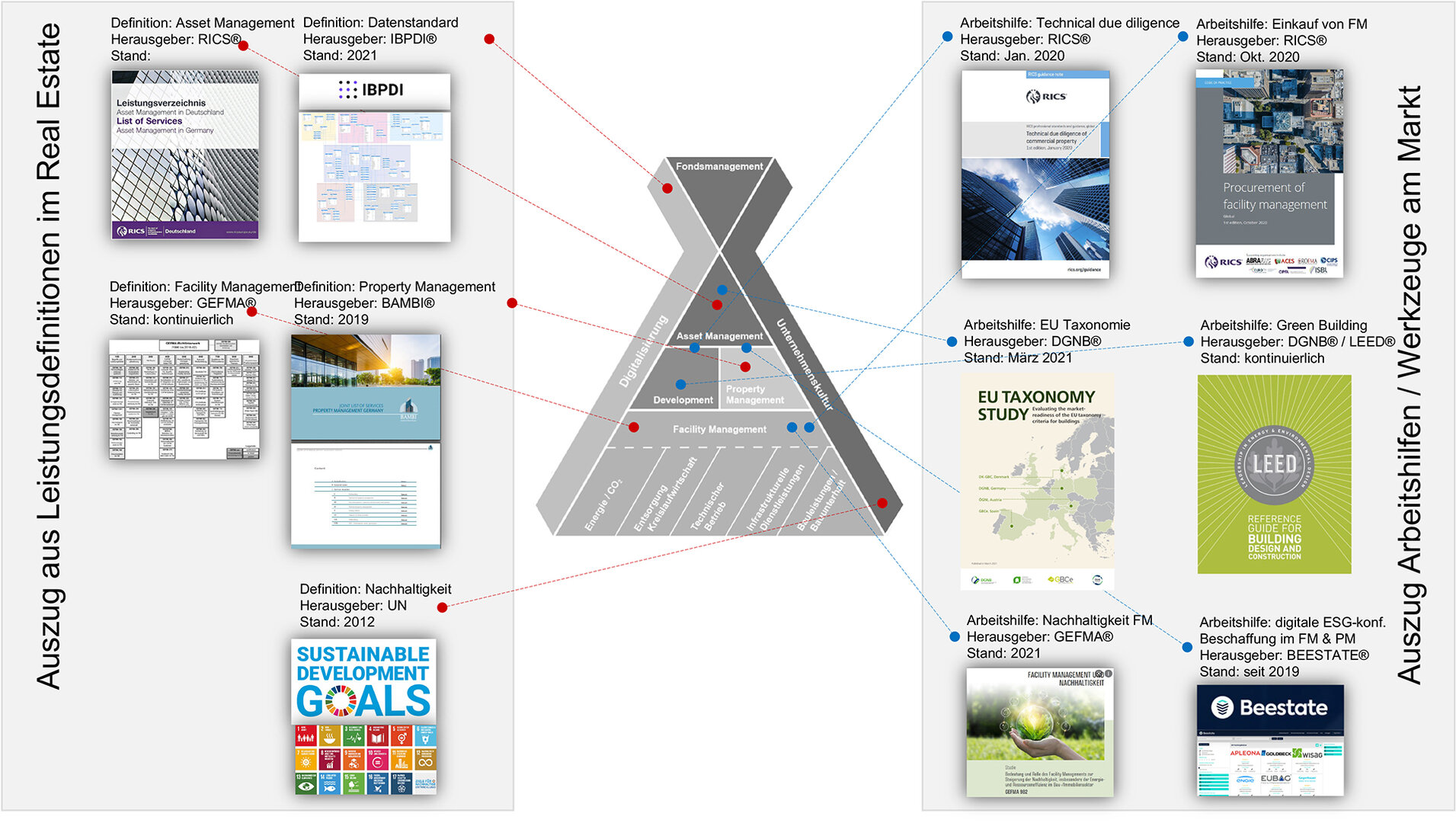 Ausgehend von der klassischen Beziehungspyramide im Real Estate Management, die von der Gesellschaft für Immobilienwirtschaftliche Forschung geprägt wurde, haben wir diese unter dem ESG Aspekt weiterentwickelt und in einer Grafik zusammengefasst: Stellvertretend für die Investment-Ebene haben wir das Fondsmanagement gestellt. Portfolio- und Asset-Management wurden unter Asset-Management zusammengefasst. Diese steuern das klassische Property-Management für den Bestand, oder integrieren Projektentwicklungen des Developments in ihr Immobilienportfolio (Neubau und Sanierung). Sowohl die Projektentwickler als auch die Asset- und Property-Manager müssen sich mit dem operativen Facility-Management auseinandersetzen. Darunter fallen operative Services in der Liegenschaft in unterschiedlichster Ausprägung; siehe hierzu Abbildung 1.