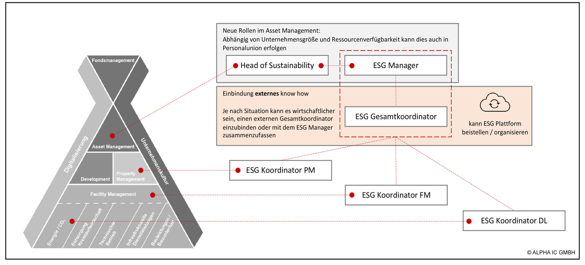 Durch das Thema ESG entsteht in der klassischen Pyramide ein Plus an Aufgaben in den verschiedenen Bereichen von der Konzeption nachhaltiger Immobilien-Anlageprodukte auf Fondsebene bis zur Umsetzung der ESG Ziele auf operativer Ebene.