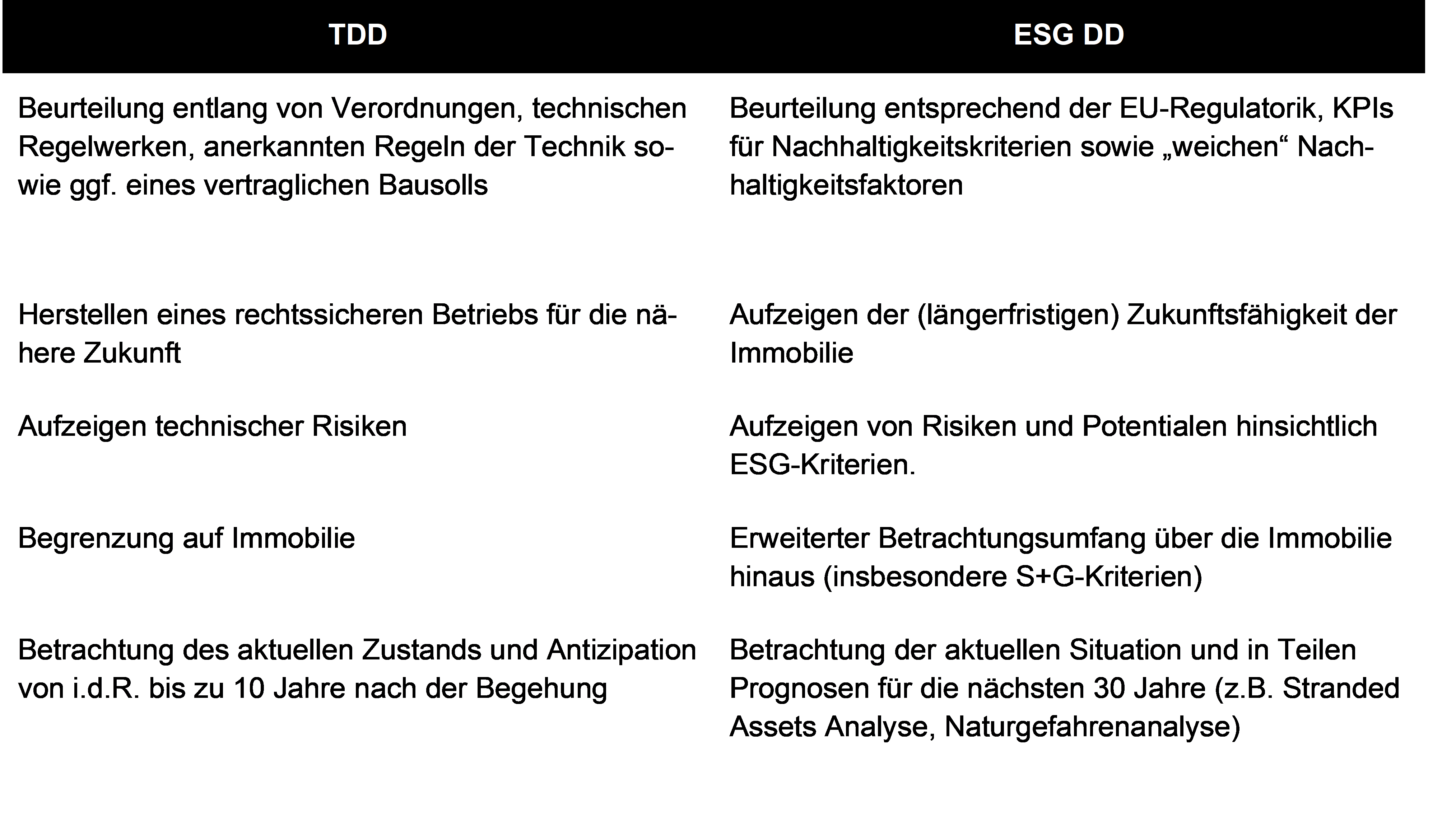 Auch wenn beide Untersuchungen unter dem Namen Due Diligence laufen, so stellen sich bei genauerer Betrachtung wesentliche Unterschiede zwischen der ESG DD und der TDD dar, wie folgende Gegenüberstellung verdeutlicht: