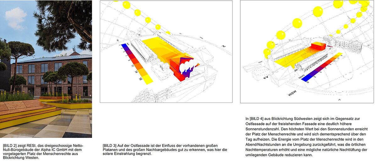 Das nachfolgende Bild zeigt links ein Foto der RESI mit dem vorgelagerten Platz der Menschenrechte, rechts daneben zwei Simulationsgrafiken, die die Analyse der Sonnenstunden aus Blickrichtung Osten sowie Westen zeigen, hier beispielhaft für den 21.Juli