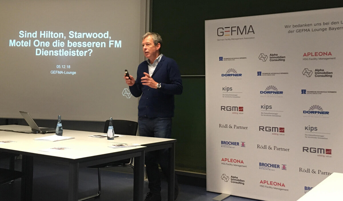 Lounge-Leiter Sebastian Hölzlein ließ im Rahmen seiner Begrüßung die GEFMA-Aktivitäten aus diesem Jahr Revue passieren und stimmte die Teilnehmer auf die Hotel-Thematik ein. Referent, Hans-Peter Klein-Schell, Partner bei Alpha IC, stellte in seinem Vortrag die provokative Frage: Sind denn Hotelbetreiber die besseren Dienstleister?