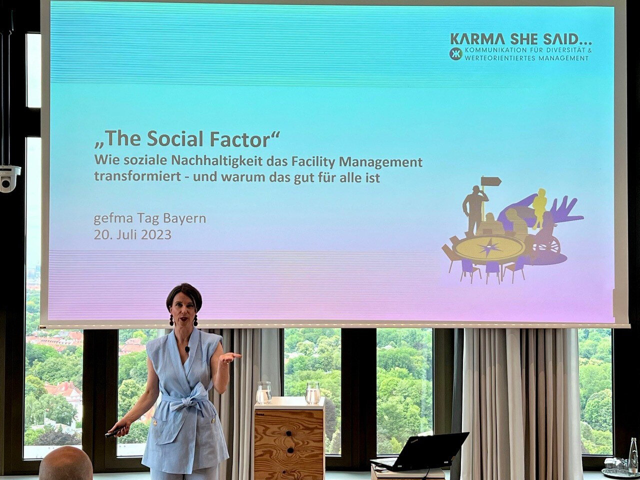 Die Frau mit der „Mission , unsere Arbeitswelt offener und menschlicher zu machen“, fokussierte sich in ihrer Keynote für den gefma Tag Bayern 2023 auf das „S für Social“ in ESG. Anne Tischer, Geschäftsführerin von Karma She Said und Vorsitzende Frauen !n Führung e. V., skizzierte eine Welt im Wandel. Ob gesellschaftlich, demografisch, klimatisch, technologisch oder auf die Krisen in der Welt bezogen, der Transformationsdruck auf Unternehmen steige ständig. Anhand zahlreicher Studien zeigte sie auf, dass eine positive wertschätzende Unternehmenskultur, Gleichberechtigung, Weiterbildung und Diversität nicht nur die Top-S-Kriterien der heutigen Jobsuchenden darstellen, sondern vor allem Erfolgstreiber sind: „Die Wahrscheinlichkeit für den wirtschaftlichen Erfolgs eines Unternehmens steigt laut einer McKinsey-Studie um 25 % bzw. 36 %, wenn es Diversität nach Geschlechtern und Ethnien gibt“, so die Referentin. In diesem Sinne gab Anne Tischer den Branchenvertreterinnen und Branchenvertretern vier Empfehlungen mit: