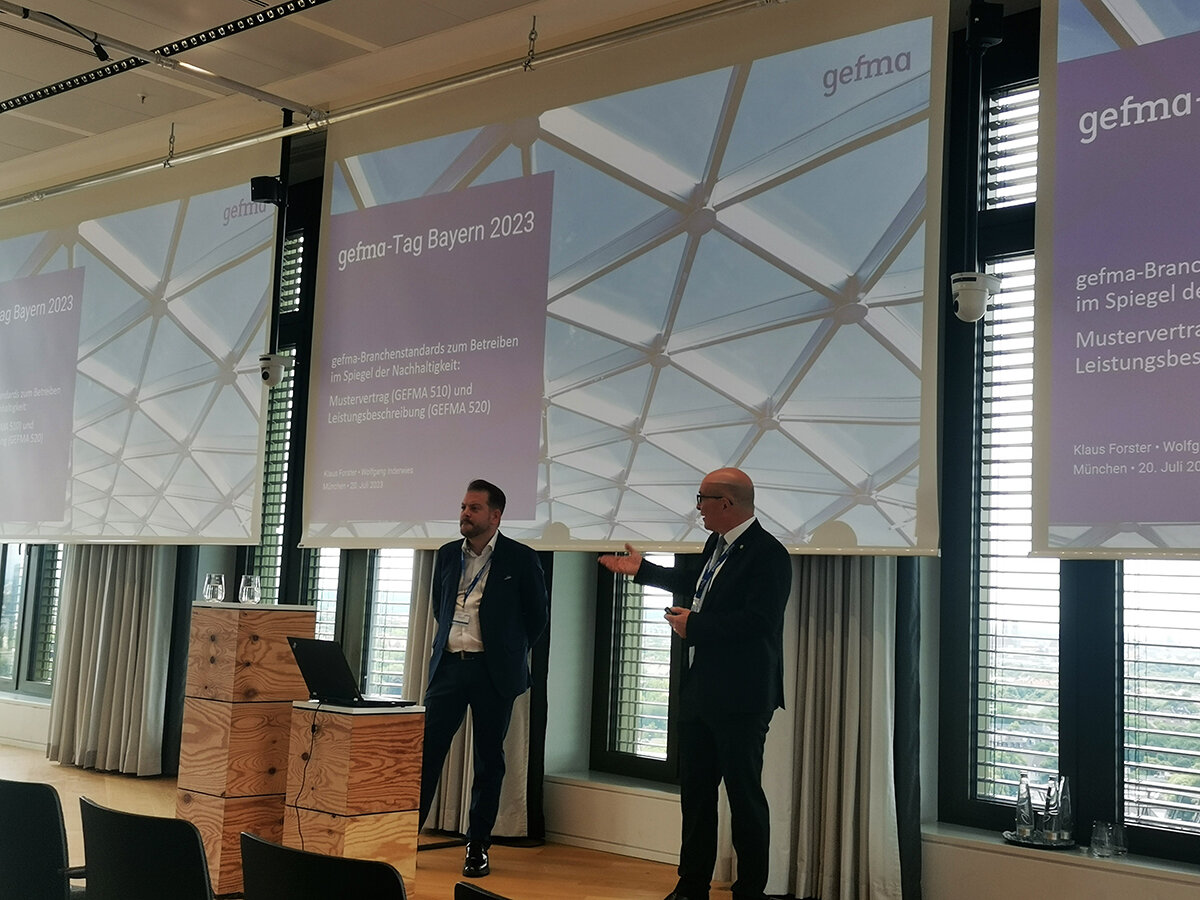 Klaus Forster, Rechtsanwalt und Associate Partner bei Rödl & Partner, und Wolfgang Inderwies, freiberuflicher Berater mit Schwerpunkt FM, leiten gemeinsam den bundesweiten gefma-Arbeitskreis „Ausschreibung und Vergabe im FM“. Sie berichteten zu „gefma Branchenstandards zum Betreiben im Spiegel der Nachhaltigkeit: Mustervertrag (gefma 510) und Leistungsbeschreibung (gefma 520)“. Der Mustervertrag sei eines der bei FM-Ausschreibungen am häufigsten verwendeten Vertragsmuster. Dazu würden in vielen Ausschreibungen Teile aus gefma 510 verwendet. Die Verlässlichkeit der gefma Unterlagen zeige sich auch darin, dass es in den letzten Jahren keinerlei Streitigkeiten um Formulierungen aus diesen Vorlagen gegeben habe. Wesentliche Neuerungen des 2023 aktualisiert erschienenen Mustervertrags und des dazugehörigen Leitfadens sind u. a. die Verankerung von ESG bereits beim Vertragsgegenstand, ein ESG-konformes Berichtswesen und die Aufnahme einer Qualitätssicherung.