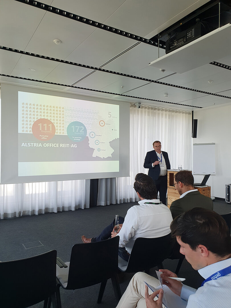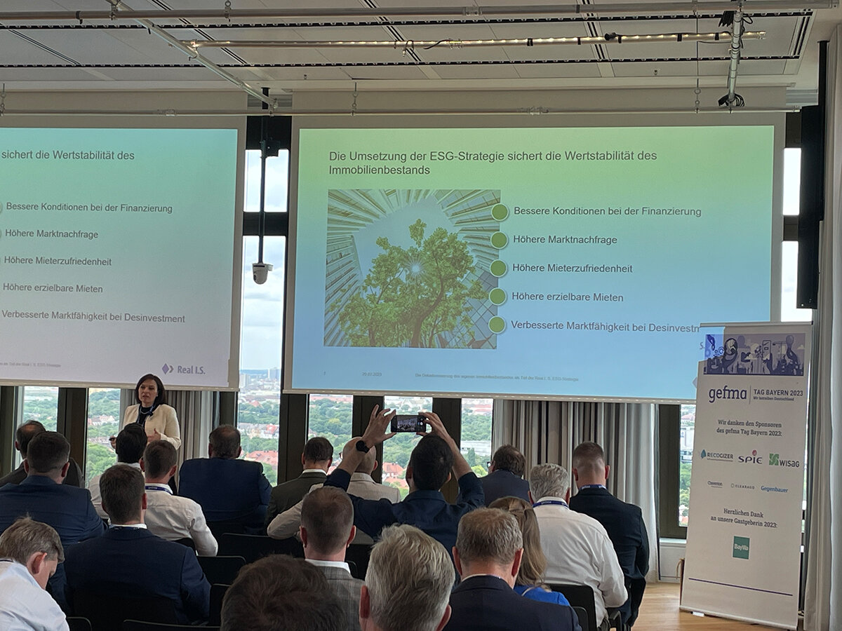 Giulia Peretti, Head of Sustainability, skizzierte in ihrem Beitrag die Dekarbonisierung des eigenen Immobilienbestands als Teil der Real I.S. ESG-Strategie mit dem Ziel einer Klimaneutralität bzw. -konformität mit dem 1,5° Dekarbonisierungspfad. Auf der Basis einer Status Quo Analyse wurden Maßnahmen zur Verbesserung der Nachhaltigkeitsperformance entwickelt, wie zum Beispiel Mobilitätskonzepte, Green Leases, Smart Meter. Ein besonders beeindruckendes Projektbeispiel für die Zuhörerinnen und Zuhörer: 40 % Wärmeeinsparung und 60 % Stromeinsparung durch Smart Data Technologie bei einer 2021 fertig gestellten Büroimmobilie. Als besonders wichtig erachtet Giulia Peretti für eine erfolgreiche ESG-Transformation eine enge und gute Zusammenarbeit von Asset, Property und Facility Managern. Die Real I. S. wünscht sich vom Personal vor Ort proaktives und initiatives Handeln hinsichtlich Energiesparmaßnahmen und der energetischen Verbesserung der Immobilien. Auf die Frage, wie man die Investoren von der eigenen ESG-Strategie überzeugt habe, antwortete die gebürtige Italienerin, dass erstens viele der ESG-Maßnahmen aufgrund der Regulatorik sowieso umgesetzt werden müssten, zudem hätten zahlreiche Untersuchungen bestätigt, dass die Wertschöpfung mit nachhaltigen Immobilien steige (bis zu 6 % höhere Mieten) und nicht zuletzt würden die notwendigen Investitionen zeitversetzt auf die einzelnen Immobilien umgesetzt.