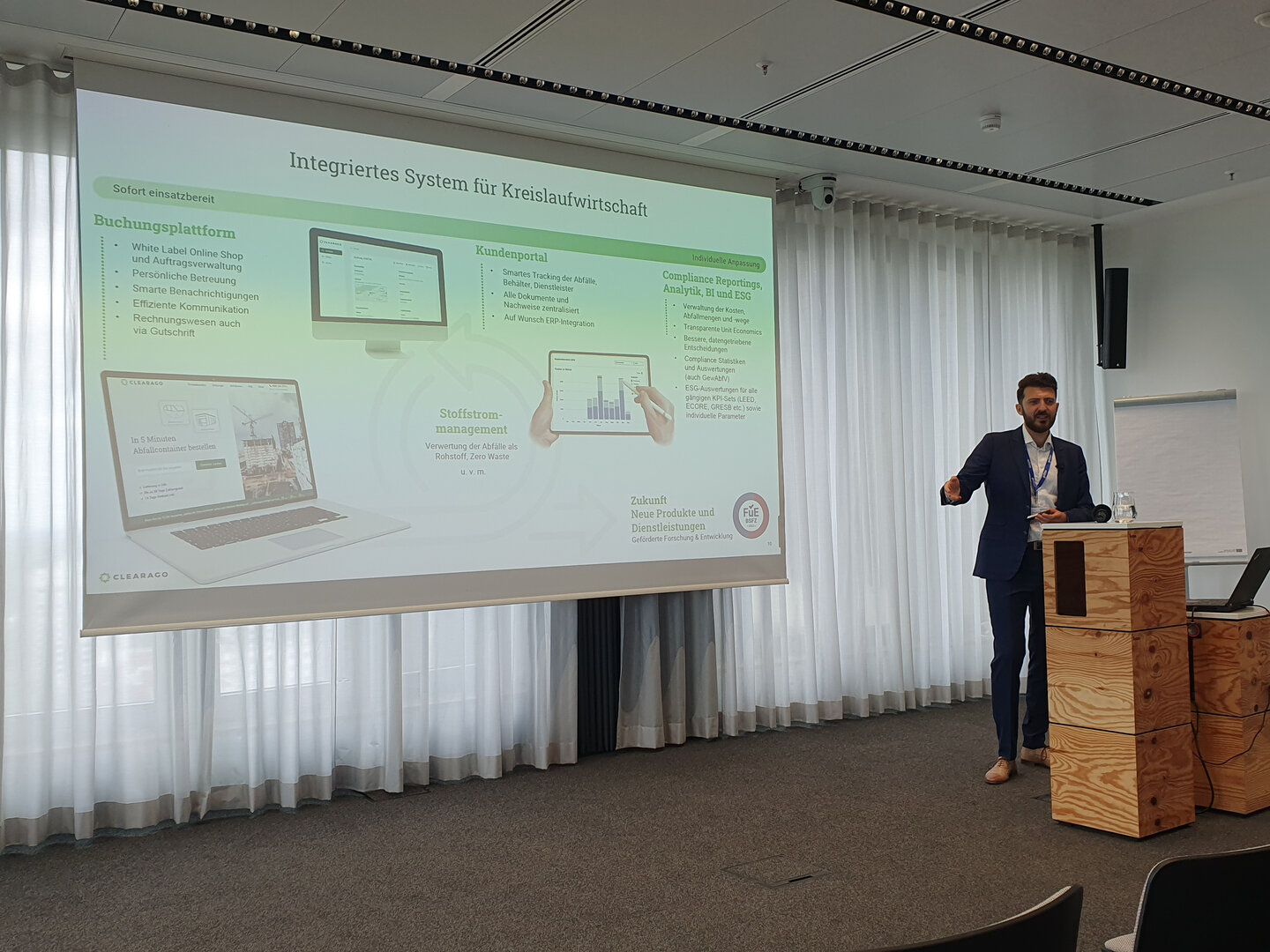 Dennis Sawin, Co-Gründer und Geschäftsführer der Clearago GmbH, hat mit seinem Partner Ritesh Mantavi die als „digitaler Nachzügler“ bezeichnete Entsorgungsbranche mithilfe Digitalisierung und neuer Technologien revolutioniert. In seinem Vortrag zeigte er die fünf Schritte vom Status Quo zum nachhaltigen Entsorgungsmanagement auf. Ziel des 2017 gegründeten Unternehmens mit Sitz in Berlin war nicht nur die Etablierung transparenter und effizienter Prozesse, um Kosten zu sparen, sondern die Implementierung eines aktiven Controllings, um Optimierungsmaßnahmen Richtung Zero Waste und die Einhaltung von ESG und Compliance zu ermöglichen. Besonders interessant für die Zuhörerinnen und Zuhörer waren die Praxisbeispiele aus unterschiedlichen Bereichen, wie Bau und Hotellerie. Optimierungsquellen waren hier zum Beispiel Füllgrade von Containern, Abholrhythmen, Abfalltrennung oder auch die Optimierung der Dienstleister. Bei laufenden Pilotprojekten im Immobilienbereich geht es aktuell um ein Benchmarking zwischen unterschiedlichen Klinikstandorten oder um ein portfolioweites ESG-Reporting im Hinblick auf das Abfallmanagement.