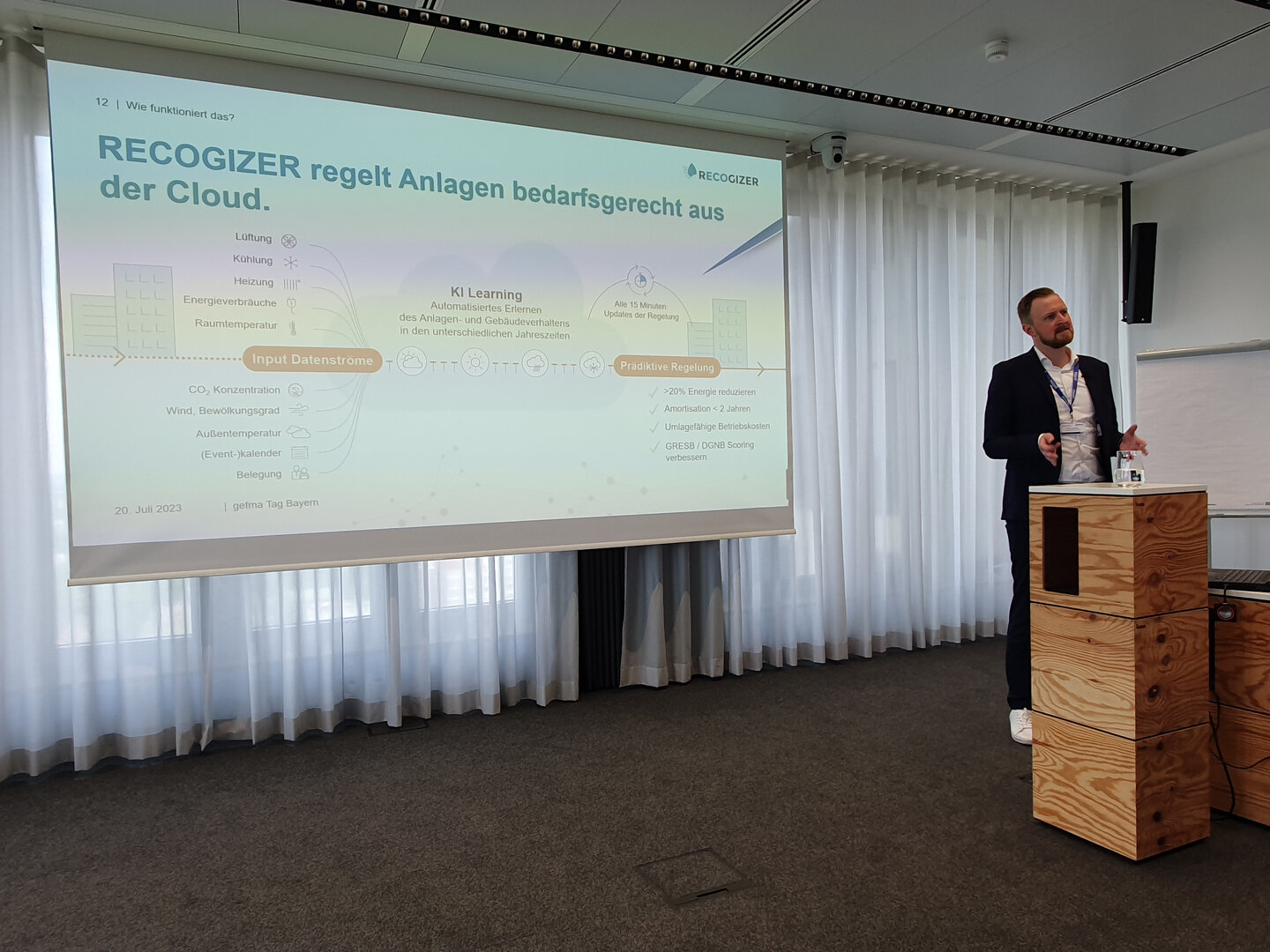 Auch Manuel Gerlach hebt mit seinem Unternehmen, der Recogizer GmbH, für die er als Head of Sales tätig ist, Optimierungspotentiale im Gebäudebetrieb mittels Digitalisierung bzw. KI. Ausgehend von dem Fakt, dass 97 % des Gebäudebestands nicht effizient genug sind, um die definierten Klimaziele zu erreichen, konnte er anhand von Praxisbeispielen bei Bürogebäuden zeigen, dass bei Gebäuden mit Gebäudeautomation 30 % CO2-Reduktion zu erreichen sind und bei Gebäuden ohne Gebäudeautomation eine 15 %-ige CO2-Reduktion. Die prädikative Cloudlösung schafft Kostenreduktionen von 20 %, die dann wieder für Investitionen in den Gebäudebestand genutzt werden können. Bereits ohne Capex-Investition können bis zu 30 % Energie und CO2 eingespart werden. Wichtig für die Diskussionsteilnehmer war die Info, dass die Kosten voll umlagefähig sind.