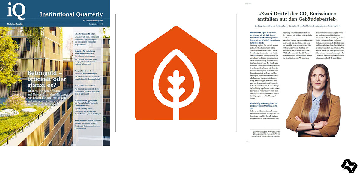Unsere Consulting-Kollegin Sophia Stettner hat mit dem BVT-Investorenmagazin Institutional Quaterly (iQ) über die Beratung nachhaltiger Bauprojekte gesprochen. Das Interview ist in der Ausgabe 04-2022 erschienen. Die ausführlichen Antworten auf die Interviewfragen haben unsere Kolleg:innen Piera Walter und Daniel Kozik gemeinsam mit Sophia erarbeitet. Hier in unserem Journal finden Sie also jetzt die Langversion des Interviews mit den detaillierteren Antworten des gesamten Autor:innenteams: