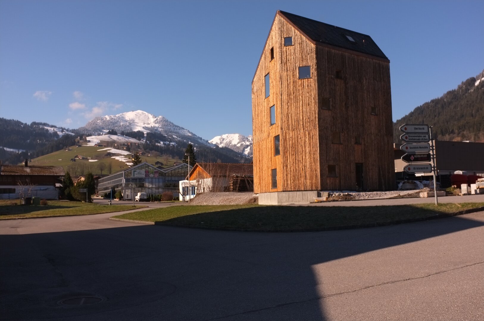 Es handelt sich um einen fünfgeschossigen, monolithischen Massivholzbau in Zweisimmen im Kanton Bern, welcher unter Verzicht auf ein Heizungssystem durch das Büro n11 Architekten realisiert wurde. Das technische Gebäudekonzept des Massivholzbaus beruht vorwiegend auf passiven Maßnahmen. Für einen optimalen Komfort im Innenraum, und um eine Raumtemperierung auf Basis von passiver Sonnenenergiegewinnung zu gewährleisten, orientiert sich das Raumprogramm rein am Sonnenstand. Zudem haben sich die Bauherren eine naturnahe Kreislaufwirtschaft gemäß des C2C-Systems sowie die damit verknüpfte Reduzierung der grauen Energie zum Grundsatz gemacht. Auf diese Weise konnten sie zeigen, dass eine klimafreundliche Zukunft im Baubereich bereits jetzt beginnen kann.