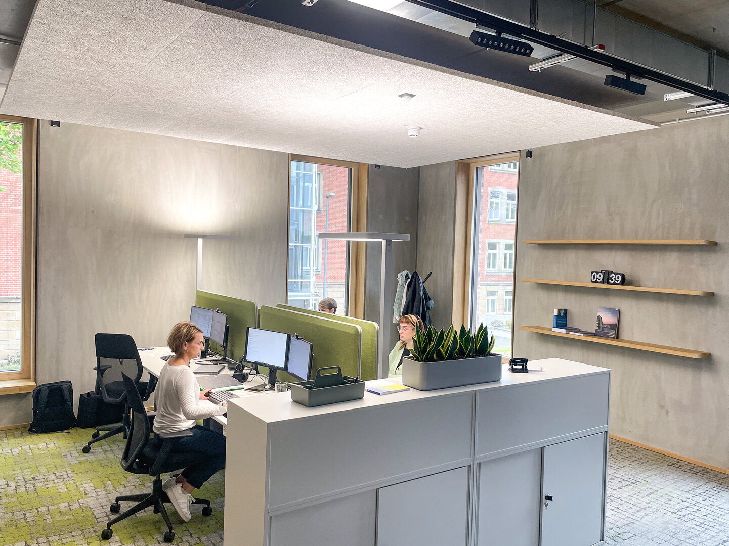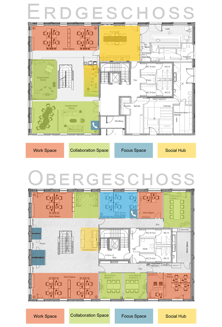 Die Idee des Activity-Based-Working besteht darin, für unterschiedliche Tätigkeiten passende Flächen zu gestalten: Neben den klassischen buchbaren Arbeitsplätzen gibt es also einen Focus Space für konzentriertes Arbeiten, Kollaborations- und Kreativ-Bereiche für Workshoparbeit mit Kolleg:innen oder auch den Social Hub für Pausen oder gemeinsame „After Work"-Events. Rund 20 % der Fläche werden mit der Mietpartei im zweiten Obergeschoss geteilt genutzt, wie etwa Besprechungszimmer, Fahrradraum und Dusche.