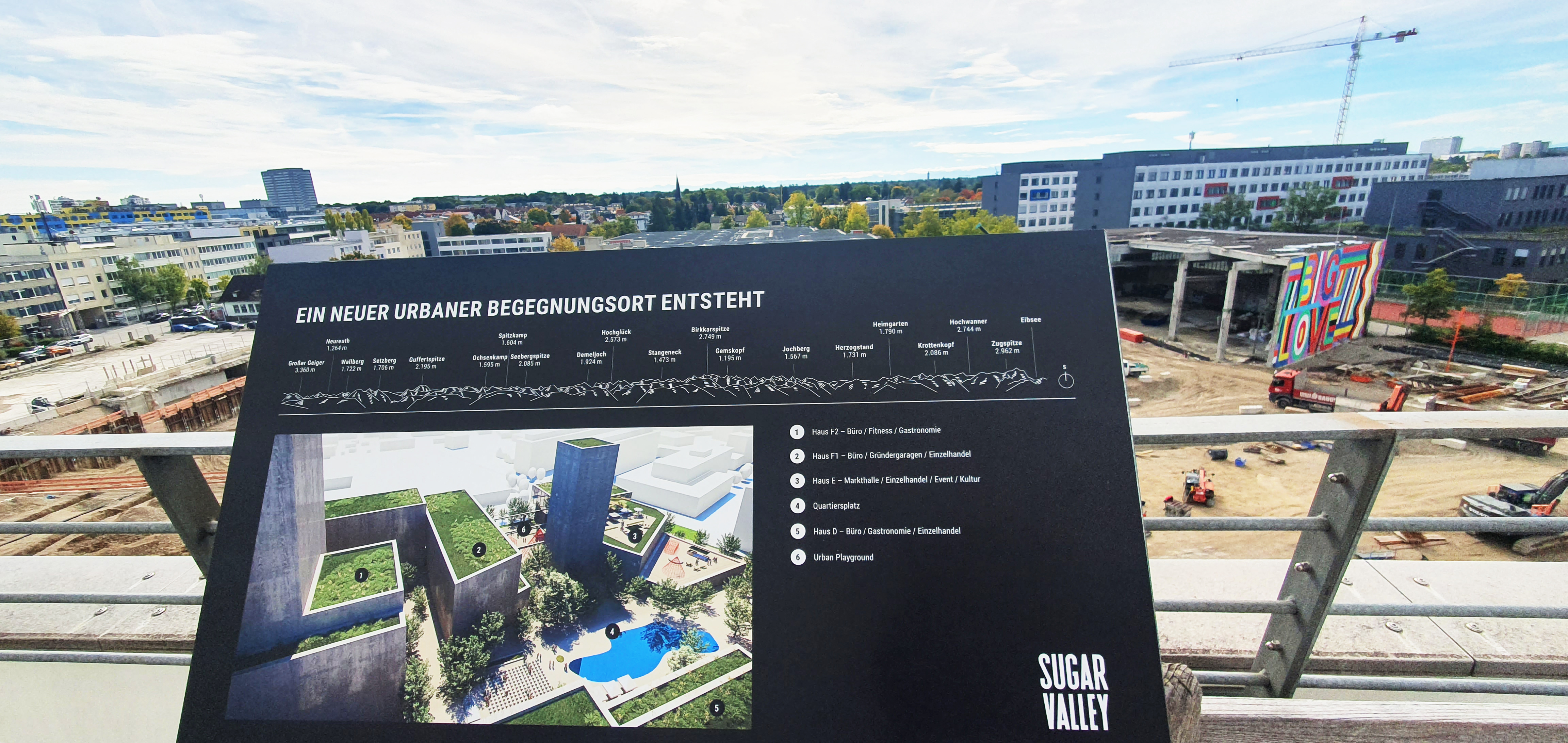 Die Sonne scheint auf die Dachterrasse der Sugar Valley Marketingsuite der Salvis Consulting AG mit Blick auf die 40.000 m² große Baustelle im Münchener Stadtteil Obersendling. Vor dem Betrachter oder der Betrachterin erstrecken sich Baugruben, Sand, halb abgerissene Gebäude und Baustellenfahrzeuge. Der angrenzende Raum ist wunderbar hergerichtet. Wir spüren Stolz, Spannung und Vorfreude.