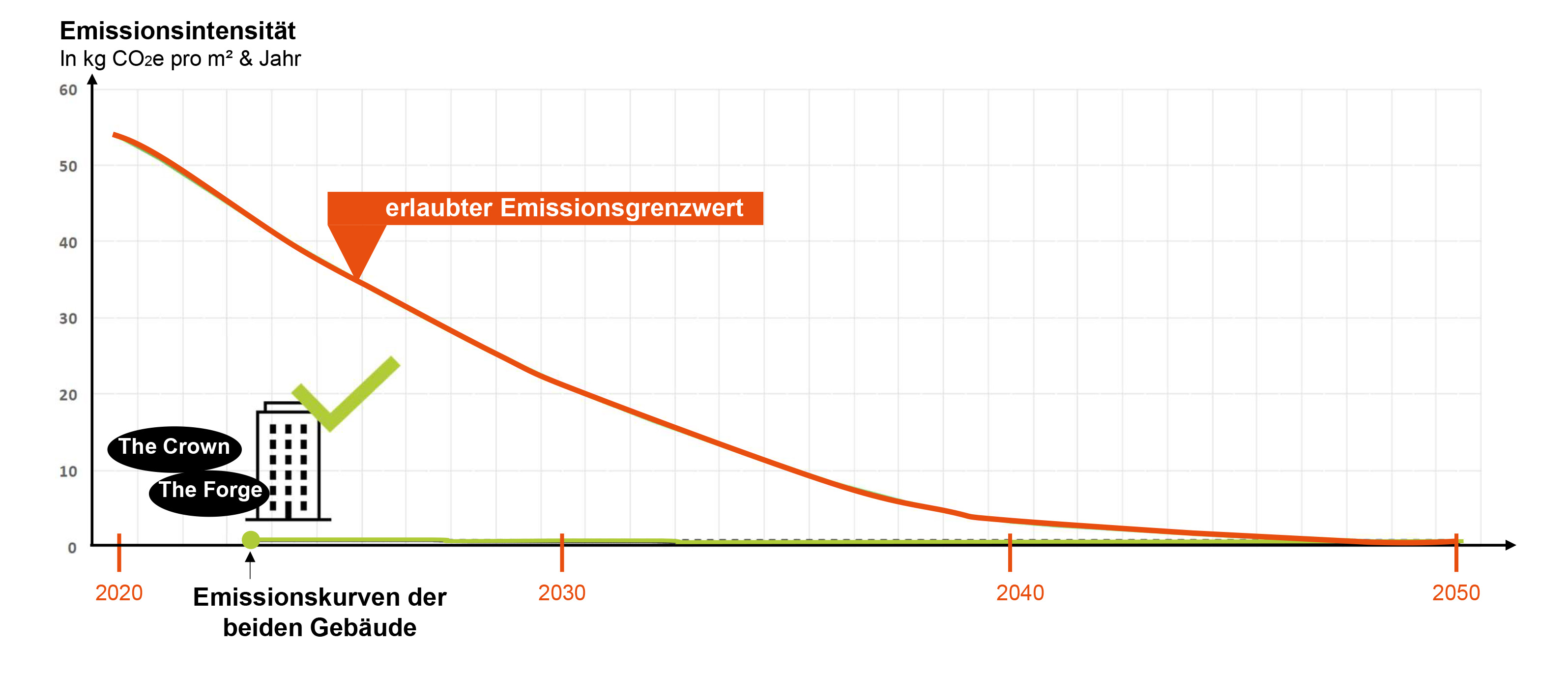 Durch die fossilfreie Wärme- und Kälteversorgung sowie gezielte Maßnahmen zur Steigerung der Energieeffizienz bleiben beide Gebäude bis 2049 bzw. 2050 dauerhaft unterhalb der zulässigen Emissionsgrenzwerte.