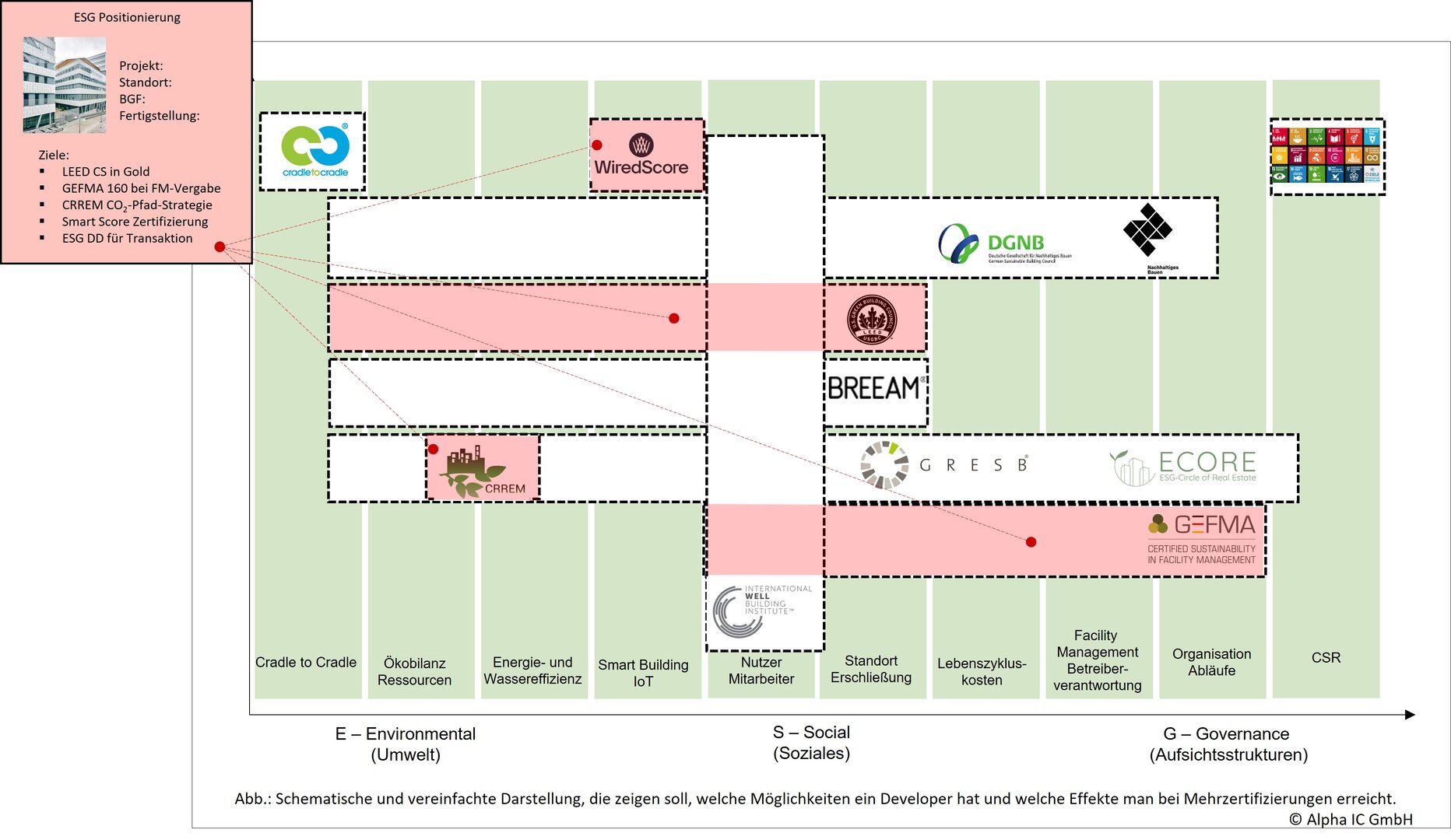 In der Regel führen wir in unseren Projekten eine ESG-Positionierung für unsere Kunden durch. Hierbei werden die Nachhaltigkeitsziele auf Basis der Strategie des Entwicklers und der Liegenschaft formuliert und die Maßnahmen beschrieben. Zwischenzeitlich kommt eine Mehrfachzertifizierung in Kombination mit SmartScore, CradleToCradle, GEFMA oder Weiteren immer häufiger vor, um durch die Kombination von ausgereiften und marktkompatiblen Verfahren einen Schritt weiter zu kommen. In den Projekten verändert sich damit die Rolle des „Zertifizierers“ sehr stark in Richtung eines „Nachhaltigkeits- (ESG-) Koordinators“, siehe hierzu auch Teil 2 dieser Blogreihe.