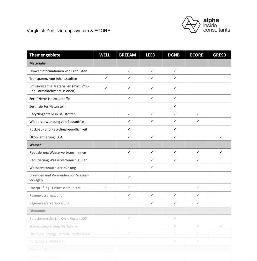 Je nach Exit-Strategie müssen immer auch Themen wie Smart Metering, Erfassung von Müllmengen oder ESG-konformes FM mitberücksichtigt werden. Ebenfalls müssen Projektentwickler sog. ESG-Benchmarkingsysteme auf dem Schirm haben. So werden die Systeme ECORE und GRESB bei der Bestandshaltung eine zentrale Rolle in der Vergleichbarkeit bekommen, wodurch auch Projektentwickler die darin enthaltenen Bewertungskriterien kennen und berücksichtigen sollten. Ein Vergleich der Bewertungssysteme, wie unten angedeutet, hat sich dabei als sehr hilfreich herausgestellt.