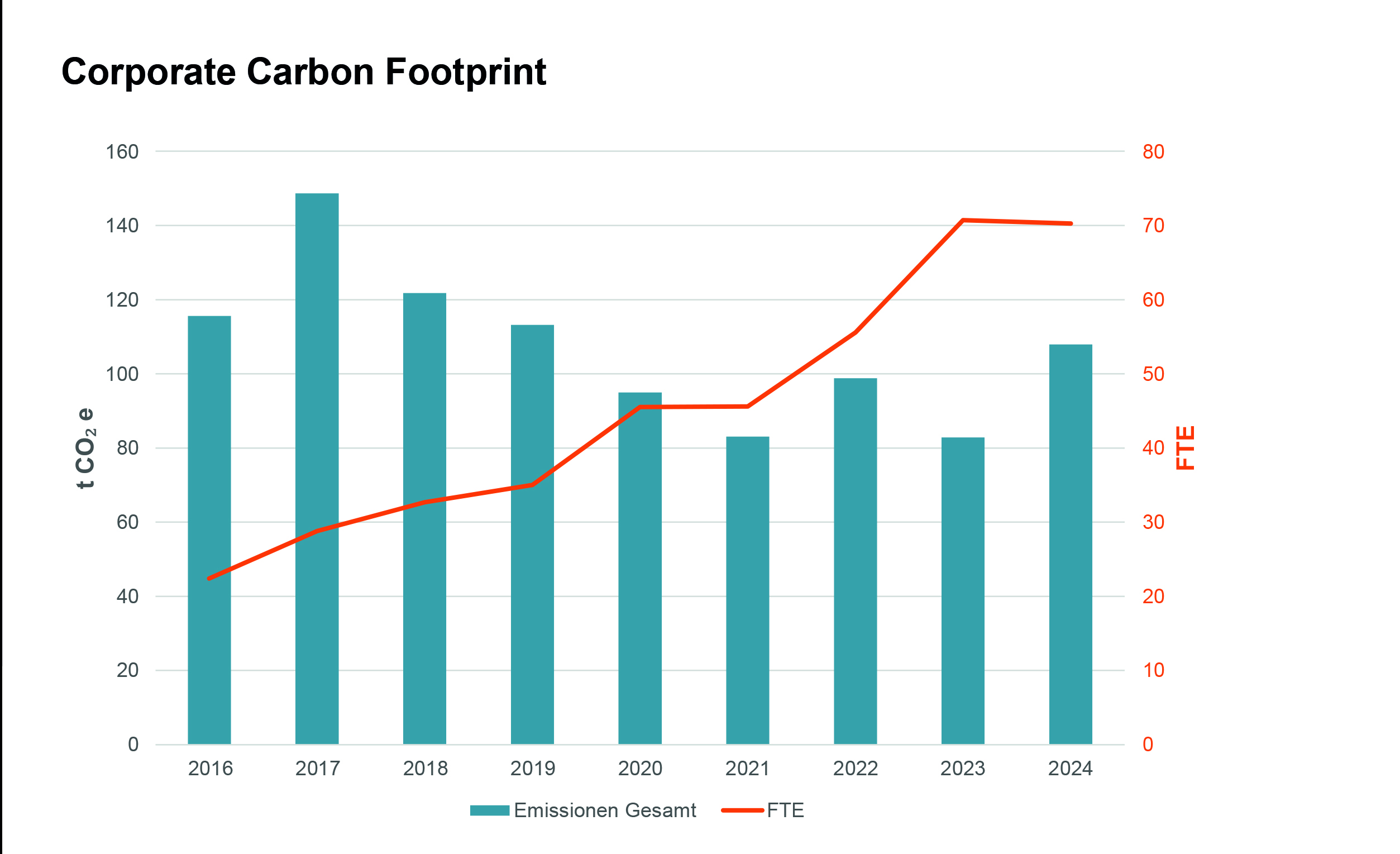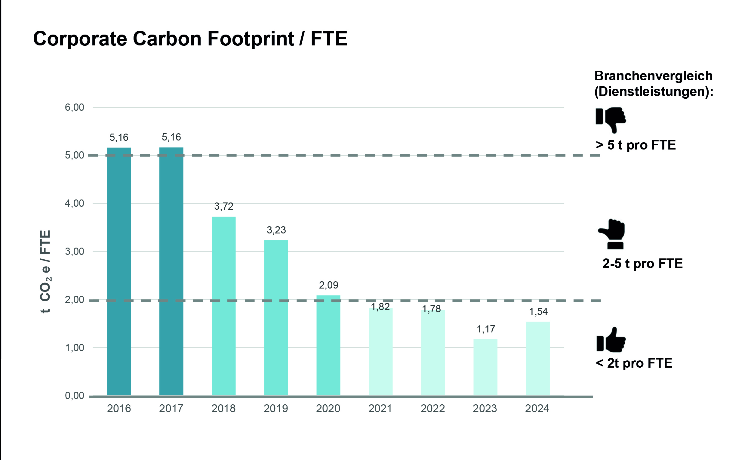 Die gute Nachricht zuerst: Seit 2021 liegen wir konstant unter 2 Tonnen CO₂e pro FTE (Full-Time-Equivalent). Damit gehören wir zu den Vorreitern in unserer Branche. Zum Vergleich: Beratungsunternehmen in Deutschland liegen im Schnitt deutlich darüber – oft zwischen 3 und 5 Tonnen CO₂e pro FTE. Wir zeigen: Es geht besser!