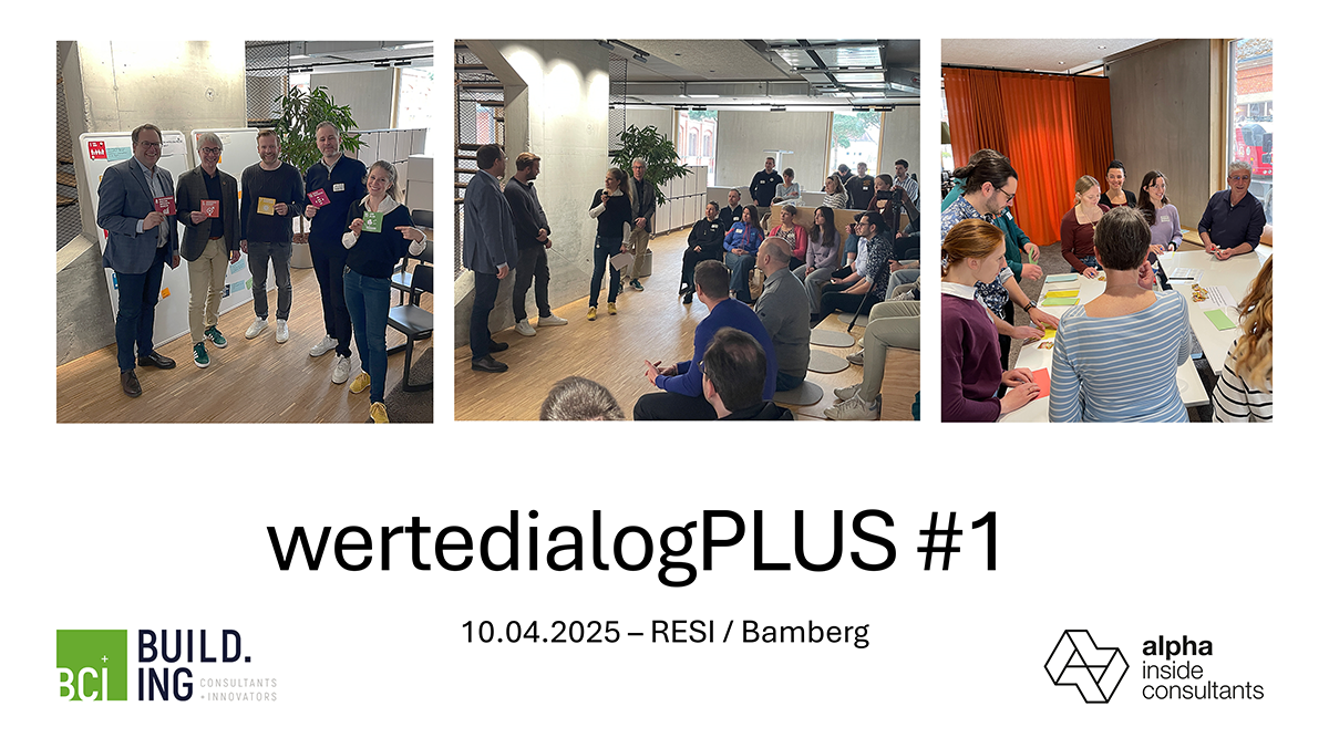 Die „Premiere“ fand mit unserem langjährigen Kooperationspartner BCI, BUILD.ING Consultants + Innovators GmbH in unserem neuen Firmengebäude, der RESI, im hybriden Format in Bamberg statt. Insgesamt 66 Teilnehmende von BCI, von Alpha IC sowie Studierende der Technischen Hochschule Nürnberg Georg Simon Ohm haben mitgewirkt. Die Idee der WertedialogePLUS ist, sich als kooperierende Unternehmen besser kennenzulernen und gegenseitig zu stärken. Aber wie geht das zusammen, eine vertrauensvolle Partnerschaft, wenn man streng genommen Konkurrent ist?