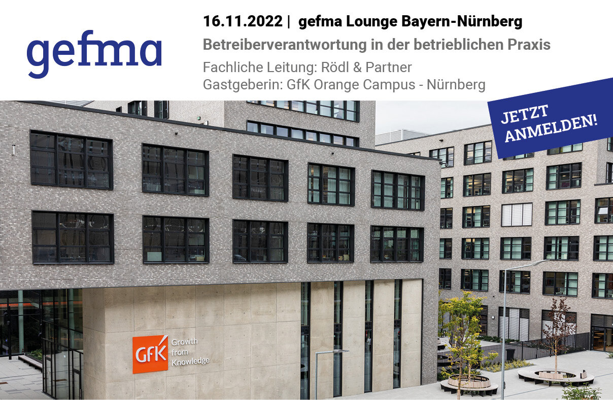 Nach einer zweijährigen Corona bedingten Pause laden wir Sie im Rahmen der gefma Lounge Bayern-Nürnberg wieder herzlich zur Neuauflage der Veranstaltung "Betreiberverantwortung in der betrieblichen Praxis" am 16.11.2022 von 8:45 bis 16:30 Uhr in den "Orange Campus" nach Nürnberg ein. Wir danken Ulrich Glauche und Rödl & Partner für die fachliche Leitung und der GfK - Gesellschaft für Konsumforschung für die Einladung in ihr neues Headquarter.